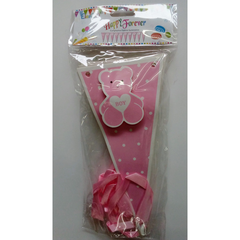 Guirnalda "BOY" rosa y blanca en forma de triángulos.