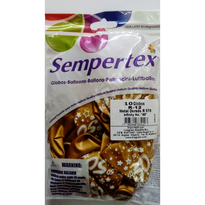 Globos impresos con el número 50 y fondo de estrellas. Color dorado.
