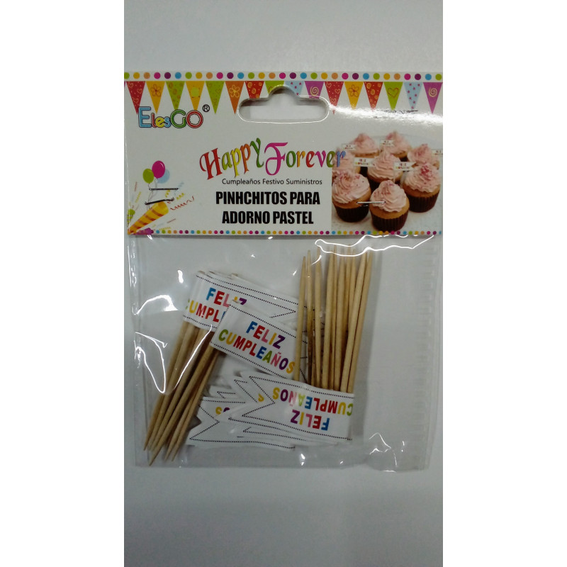 Pinchos decorativos con forma de banderines blancos con las letras de FELIZ CUMPLEAÑOS en colores.